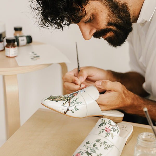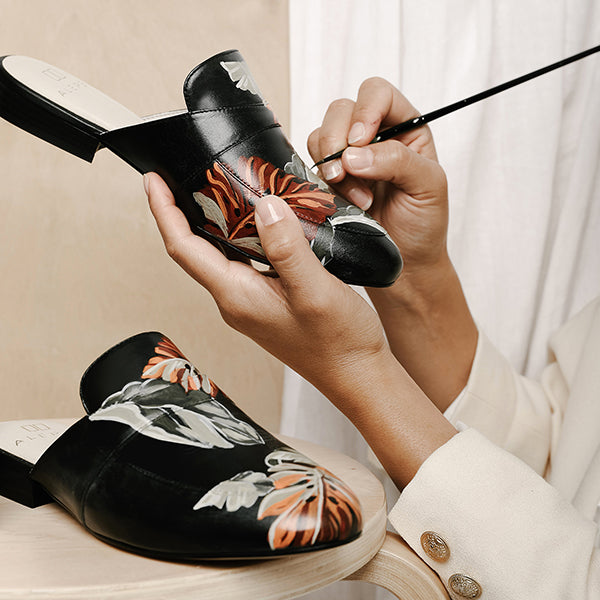 Architect-turned-shoemaker Adriana Epelboim-Levy has found a way to merge her passions for architecture, art, and fashion with ALEPEL, a collection of statement shoes and accessories. All one-of-a-kind, the collection starts with a star material—Nappa Leather—a material that is a by-product of the food industry. A least 50% of their leather is vegetable tanned (they’re working towards 100%) and is made in Porto Alegre Brazil by a tannery that uses proper equipment, waste management procedures and fair labor to make top quality materials. All of the shoes come unpainted and arrive as the perfect canvas for local artists to hand paint. First they are conceptualized and designed by Adriana and her creative team, then the artist is trained to translate the design onto the shoe or accessory. Every artist has their strength and often an artist will paint a pattern that plays to their skills—whether that be florals, graphic motifs or animal imagery—the beauty of the production process lay in the artistic perspective each painter brings to every piece.