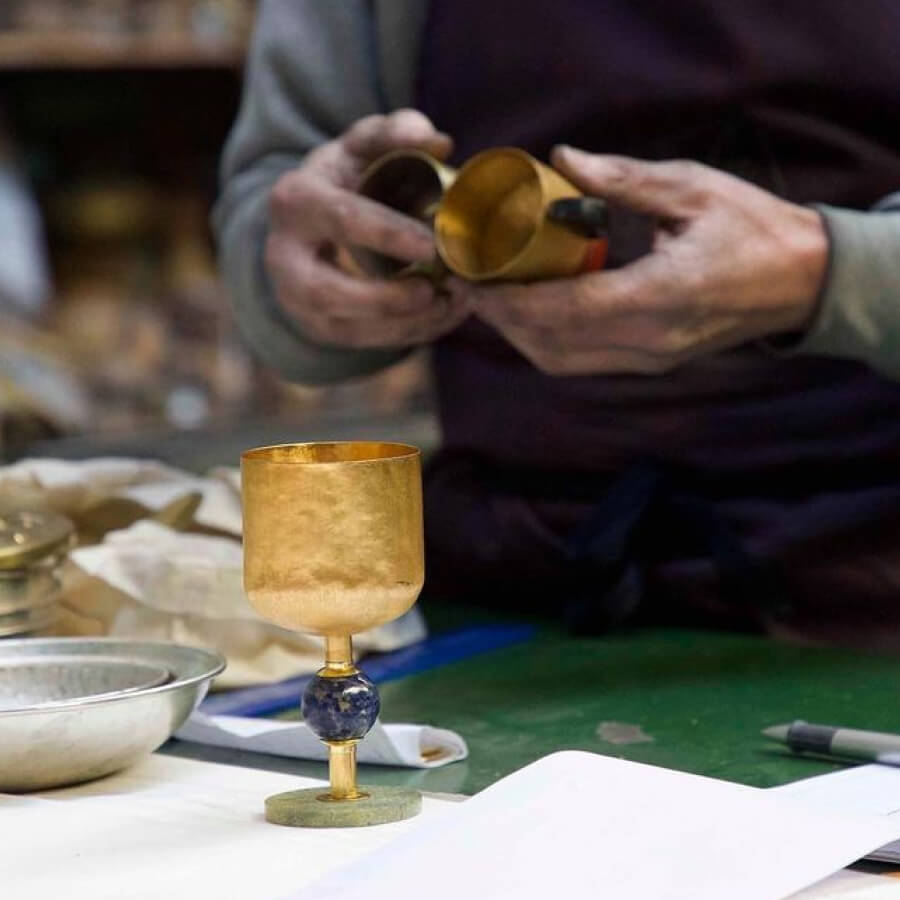 Criado’s pieces are made-to-order by master artisans who use responsibly sourced materials. All stones come from Colombia and Brazil and are reclaimed and repurposed, just like the Italian metals. Criado works with families of artisans in Italy who are keepers of age-old techniques, like glass blowing and traditional silversmithing, which were once important sources of income for whole communities.